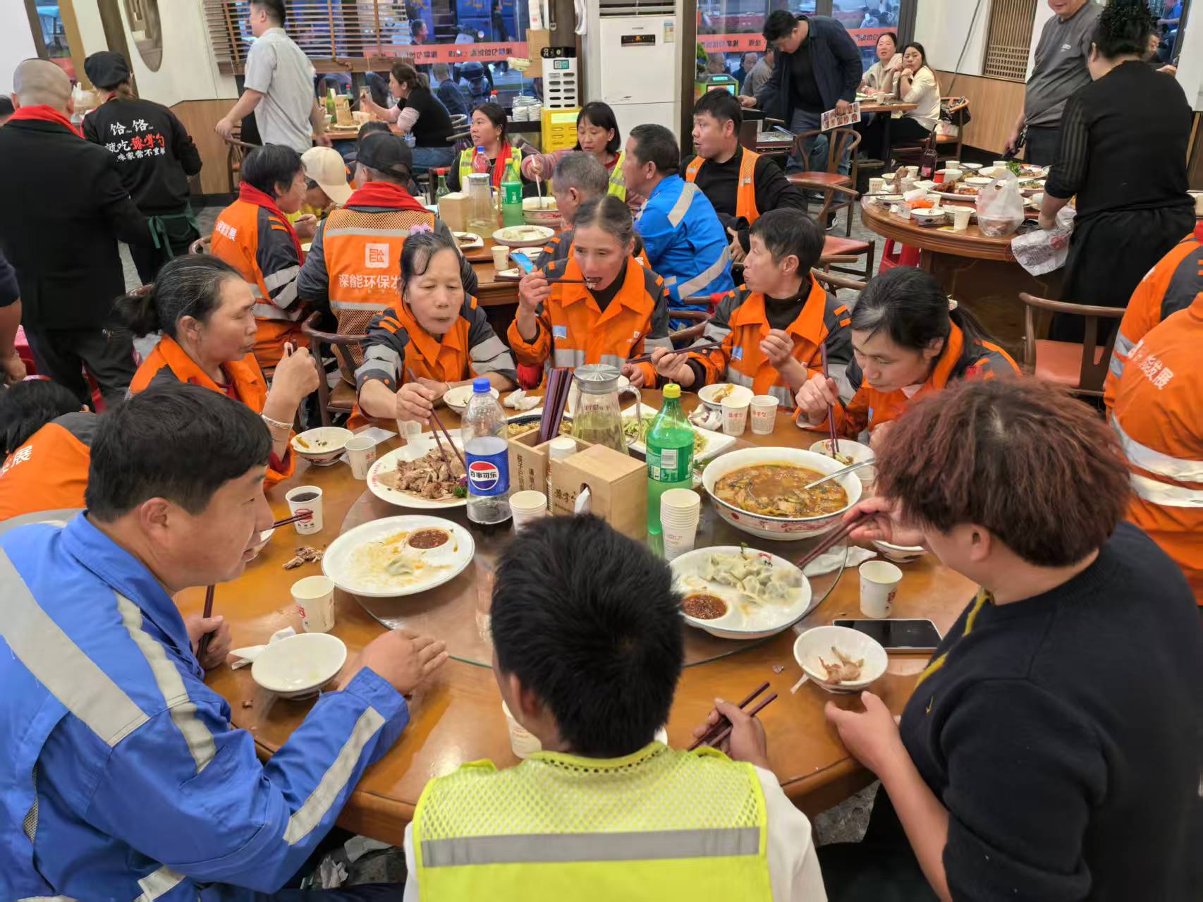 活動(dòng)當(dāng)天,剛剛結(jié)束清掃工作的“城市美容師”們身穿工服陸續(xù)抵達(dá)。張高鵬早已在門口迎接,熱情問(wèn)候每一位工人并送上新春祝福。席間,道口燒雞、五香牛蹄筋、酸菜魚等十多道佳肴相繼上桌,暖意融融的用餐氛圍中,歡聲笑語(yǔ)不斷,如家人般親切溫馨。