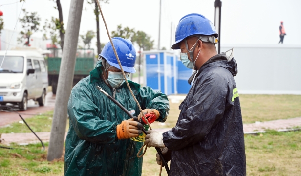 3月25日,在太康縣北環(huán)路核酸檢測(cè)方艙和隔離方艙建設(shè)現(xiàn)場(chǎng),國網(wǎng)太康縣供電公司工作人員正冒雨施工為其提供電力保障。