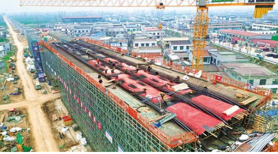 3月14日上午,中鐵十局工人在平漯周高鐵9標(biāo)段工地上開展岔道連續(xù)梁施工。