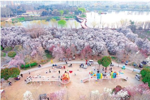 3月16日,項城市人民公園樹木蔥郁、色彩斑斕,綠植、觀景步道、湖水、民居相映成景,宛如一幅多彩的春日生態(tài)畫卷。