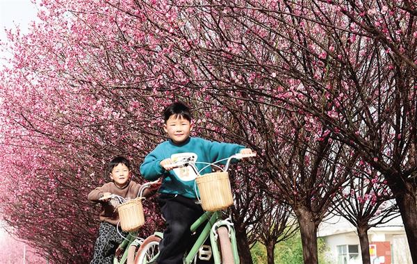2月25日,扶溝縣金果農(nóng)千畝果園的溫室大棚內(nèi)桃花綻放,果農(nóng)正忙于疏花疏枝,加強(qiáng)春管爭(zhēng)豐收。