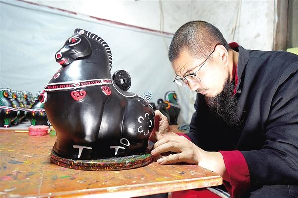 該日上午,邵波與妻子劉保青及工匠們正加緊趕制馬年系列作品《馬上有財(cái)》。與傳統(tǒng)泥泥狗古樸神秘的風(fēng)格不同,這組馬年作品呈現(xiàn)出明顯的“萌寵化”特征。