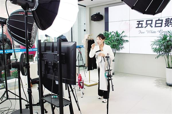 近日,在太康縣返鄉(xiāng)創(chuàng)業(yè)服飾產(chǎn)業(yè)園,一家服裝企業(yè)的工作人員通過網(wǎng)絡(luò)直播的形式售賣服裝。