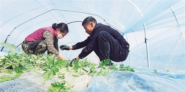 3月15日,在扶溝縣江村鎮(zhèn)江北村現代農業(yè)產業(yè)園的大棚里,農戶在管理西瓜苗。該園區(qū)占地500余畝,主要種植麒麟美都西瓜、太陽花水果玉米、優(yōu)質菠菜,預計每畝年綜合收益1.2萬元,輻射帶動周邊200余名群眾在家門口就業(yè)。