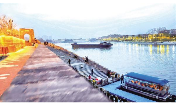 傍晚的普濟門河畔,石拱門暖燈初上,步道階梯延伸向沙潁河。游船燈串與沿岸燈火在水面搖曳,貨船駛過,游人漫步,絕美景致交織成周口溫柔的暮色畫卷。
