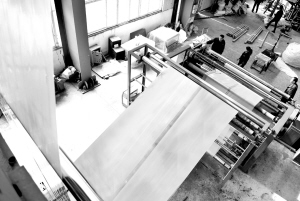 淮陽縣銀豐塑料有限公司流水生產線一瞥。該公司擁有大中型吹塑膜機組40多臺、制袋生產線6條,并擁有完備的塑料制品化驗檢測設備。生產的農用塑料膜等產品暢銷蘇、魯、豫、皖等地,遠銷美國、韓國等國家。(記者 沈湛 攝)