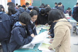 該校將課堂名字定為“求真大課堂”,以“真”字作為學校一切教育教學和管理的衡量標準。朱貴華說,求真就是要真教、真學、真嚴、真愛、真實、真會。為提高課堂教學效果,該??偨Y出一套獨特的課堂教學方法——“七音和鳴”。分管教學工作的副校長徐其運用“1234567”,即哆來咪發(fā)唆拉西”來詮釋“七音和鳴”法?!?”就是一個學習目標;“2”就是提前兩分鐘進班,布置2個任務(出示目標、檢查學情);“3”就是準備3個本子,即學情檢效本、跟蹤本、糾錯本;“4”是4個維度考評,即高速度、準確度、干凈度、參與度;“5”是5個跟蹤,即節(jié)跟蹤、日跟蹤、周跟蹤、月跟蹤、學期跟蹤,堅持“抓緊跟蹤不放松、我在文昌必成功”的教育信念;“6”是6個環(huán)節(jié),即激情導入、自研自探、合作探究、展示質疑、師生點評、當堂檢測;“7”是7個評價,即教師的教案、學生的學案、練案、觀課記錄的每周業(yè)務評價及對學生的即時性、激勵性、長效性評價。