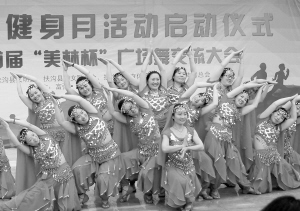 5月10日上午,扶溝縣一女子代表隊在臺上表演舞蹈。當日,扶溝縣2015年健身月啟動儀式暨廣場舞交流大會拉開帷幕。來自全縣各鄉(xiāng)鎮(zhèn)巾幗代表隊依次走上舞臺,展現(xiàn)其優(yōu)美的舞姿。在接下來的一個月里,該縣還將聯(lián)合各類體育協(xié)會在城區(qū)開展武術(shù)、跆拳道等體育活動。盧付昌 申蘭霞 攝
